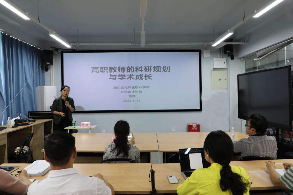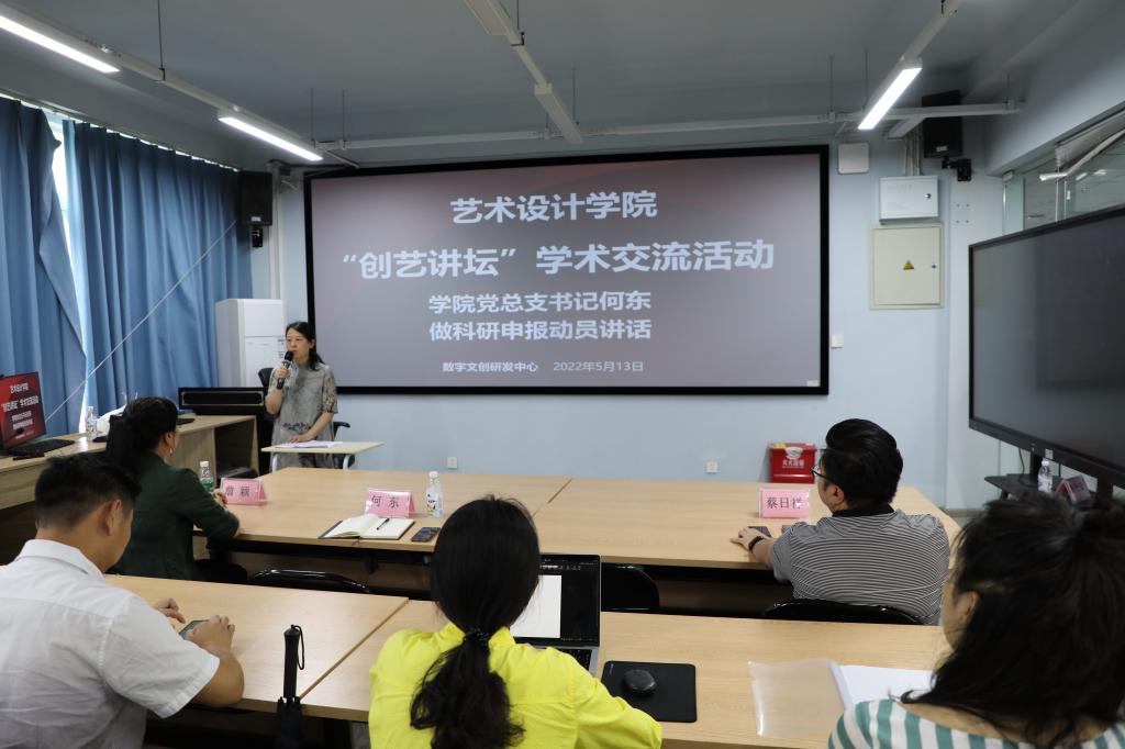 鉴于2022年校级科研课题、科研创新团队及教改课题申报在即,艺术设计学院于5月13日在一教402室开展第一期“创艺讲坛”学术交流活动,主题为“高职教师的科研方向与项目申报”,主讲人为学院院长詹颖。艺术设计学院主要领导及全体专兼职教师参加了本次活动。