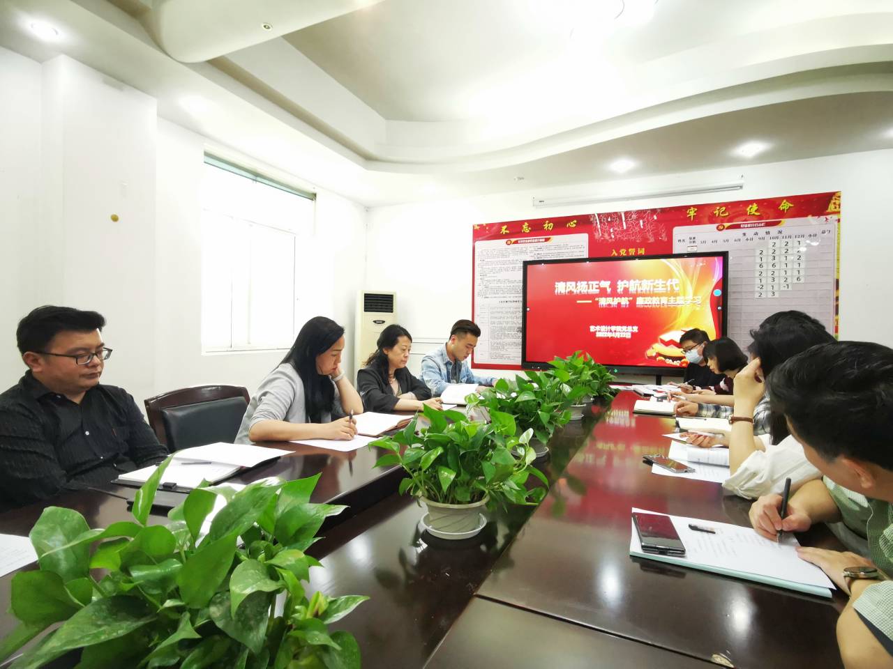 艺术设计学院党总支全体党员和80后青年教师参加本次会议,会后全体参会人员领取《家庭促廉倡议书》,清风促廉携家人共护航。