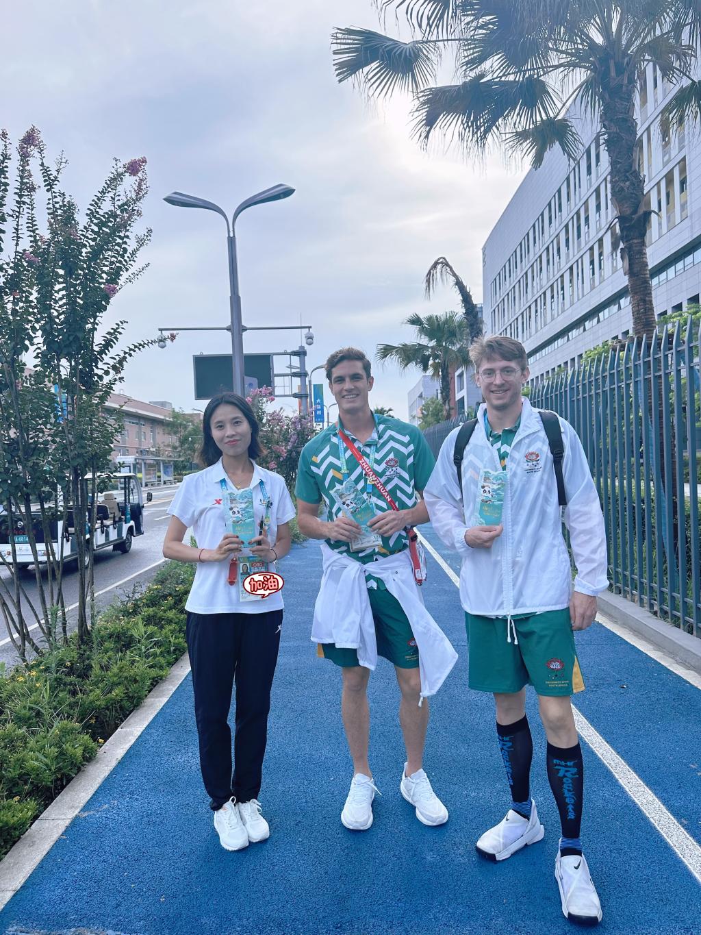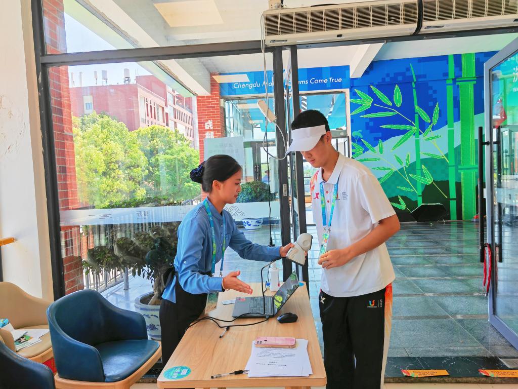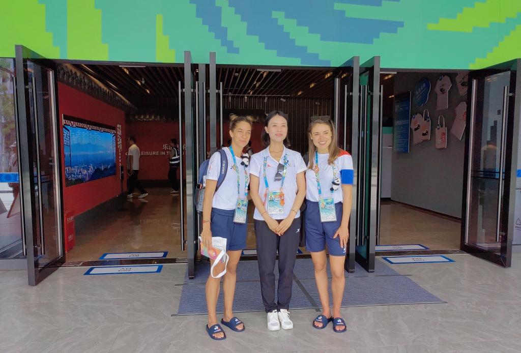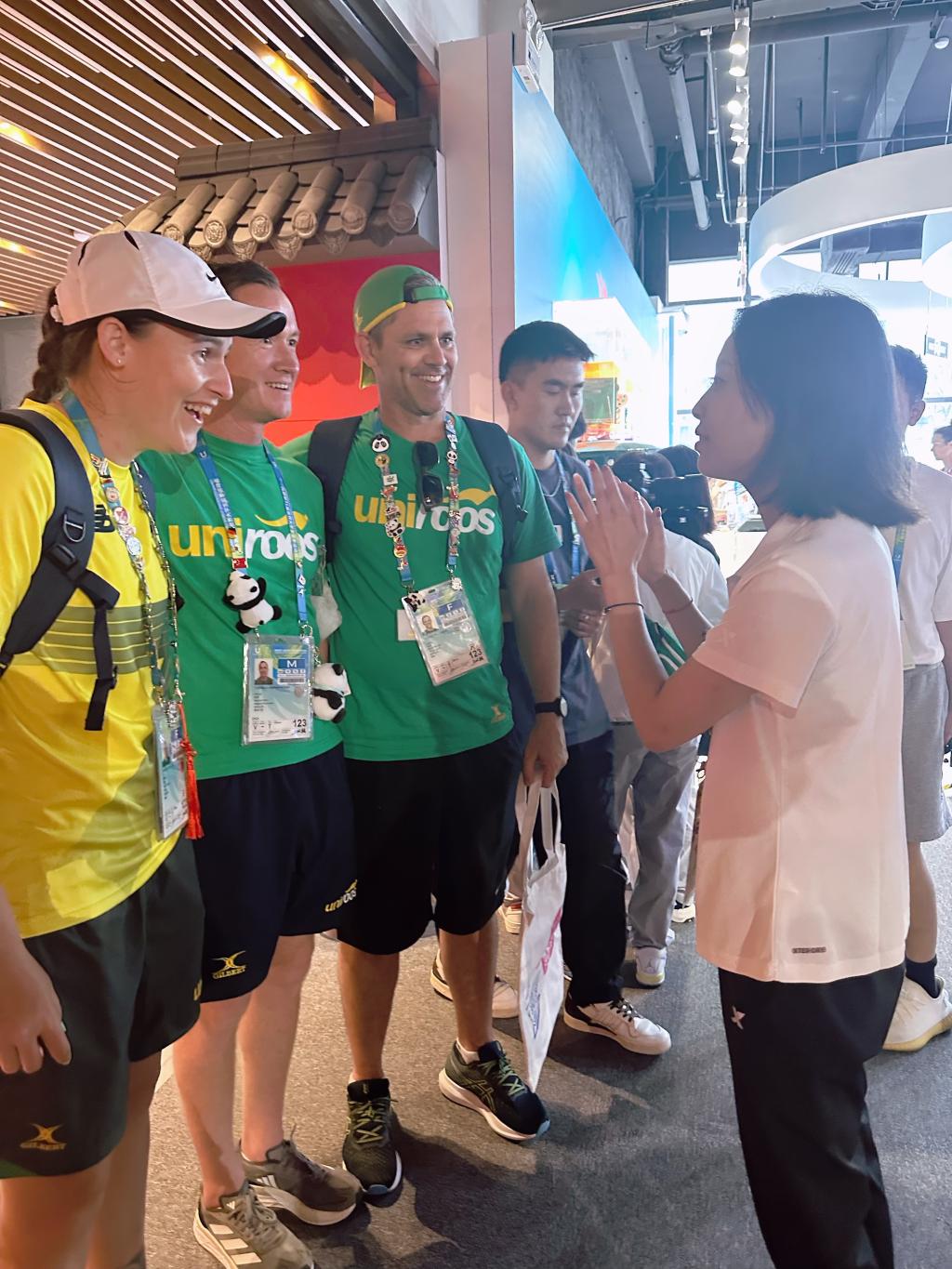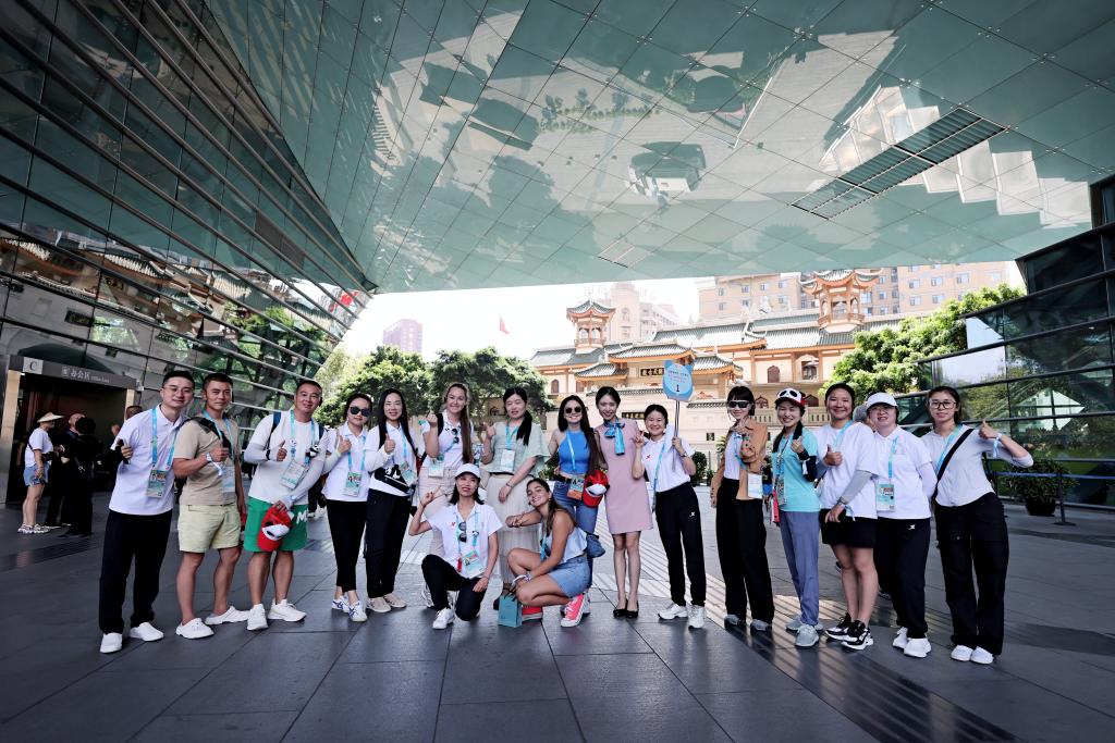 在大运村,张静给来自澳大利亚、意大利、巴西等国家的运动员和官员介绍了成都城市文化活动,并主要负责成都博物馆、宽窄巷子、安仁古镇、成都大熊猫繁育研究基地等景区讲解。