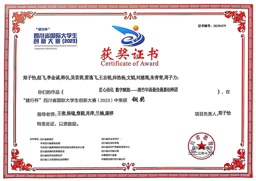 2023年12月30日,由四川省教育厅、中共四川省委统战部、中共四川省委网络安全和信息化委员会办公室、四川省发展和改革委员会等主办的“建行杯”四川省国际大学生创新创业大赛(2023)颁奖典礼在四川师范大学成龙校区举行,我院师生团队荣获铜奖。