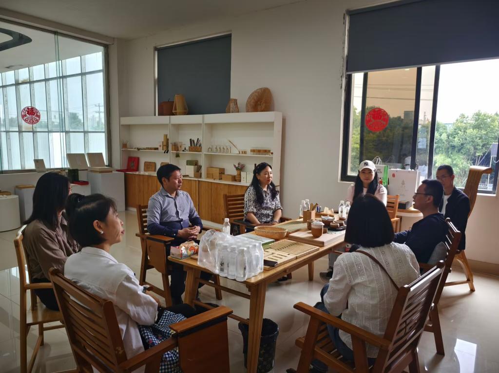 詹颖一行在青神国际竹艺城发展投资有限公司副总经理彭泽辉和首席技术员黄海的带领下参观了公司展厅和实验室,并进行了深入交流。彭泽辉对詹颖一行的到来表示欢迎,他介绍了青神国际竹艺城发展投资有限公司的基本情况及其独家专利保青工艺的特色。他表示,公司的发展急需专业设计人才加入,提高产品的功能性和审美性。双方可共同建立产教融合基地,共同培养专业人才,吸纳优秀学生实习就业,实现合作共赢。