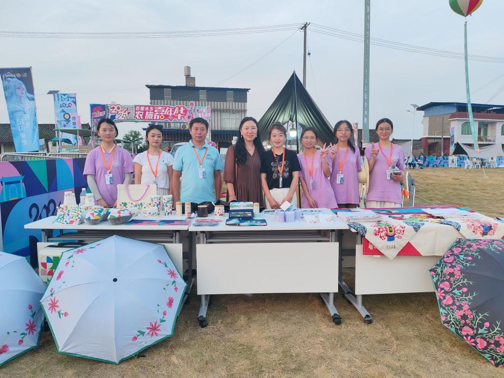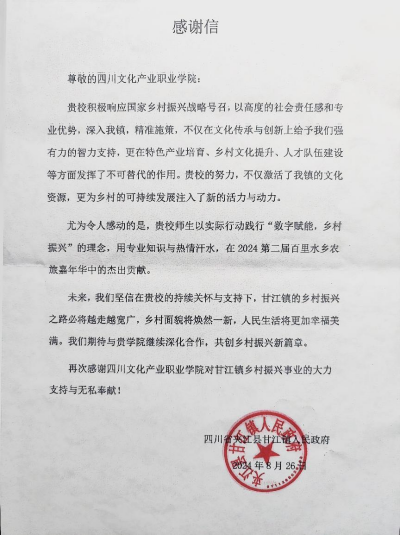 夹江县甘江镇是四川文化产业职业学院艺术设计学院“乡村振兴实践基地”,我院高度重视与甘江镇的校地合作,积极以专业技能服务地方经济发展。根据此次活动统筹安排,我院承担创意策划、艺术设计及现场服务等工作,为保障活动顺利开展,学院提前组织了5名教师、14名学生组成“数字文创赋能乡村振兴”暑期社会实践服务队,冒着酷暑深入甘江镇进行前期准备工作。学生们在团队老师精心指导下,对甘江镇滨河社区、金银河村、新生村、新兴村等地进行深入调研,结合当地特色农耕文化、“青衣江流域”水系文化、“东风堰”灌区文化、“杨公阙”汉风文化、“二郎庙”道教文化等进行创意策划。在此基础上,师生团队高质量完成了本次活动的相关视觉设计和文创产品设计、农副产品包装设计,打造了别具特色的活动主会场和美食文创区,定制活动伴手礼超过5000件,充分展现了甘江镇“百里水乡”的农旅文化新形象,获得当地政府和参与群众高度赞赏。活动期间,团队师生还参加了线上直播宣传、线下宣传视频拍摄、宣传推文编排,活动现场布置、文创集市展陈、团队后勤保障等工作,以良好的精神风貌、吃苦耐劳的工作态度赢得了一致好评。8月29日,甘江镇人民政府发来感谢信,赞扬和感谢我院师生在助力当地乡村振兴事业中的重要贡献。