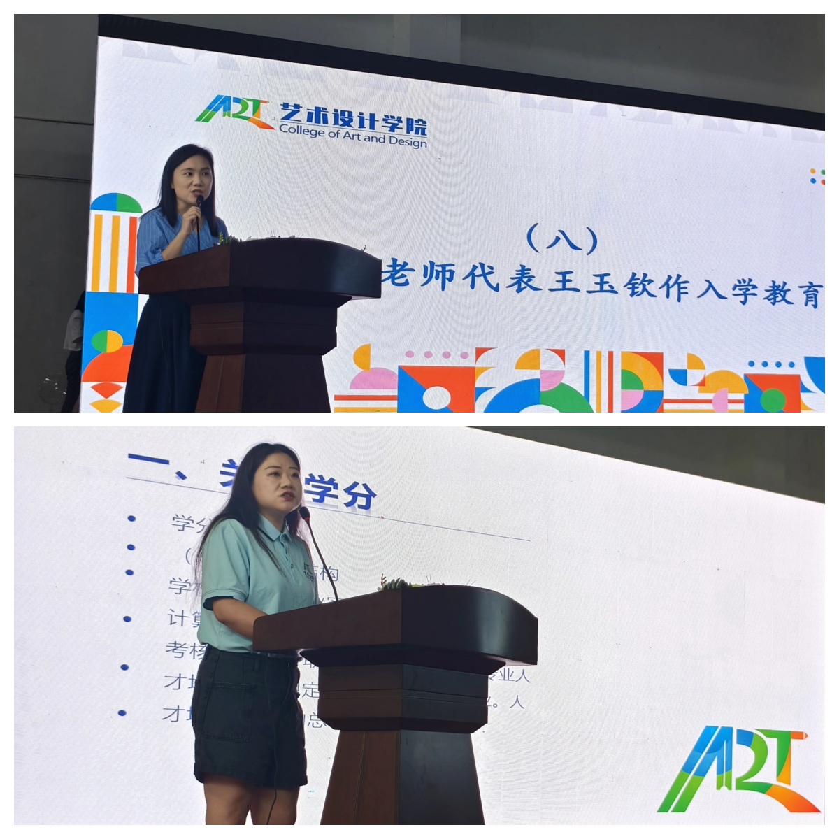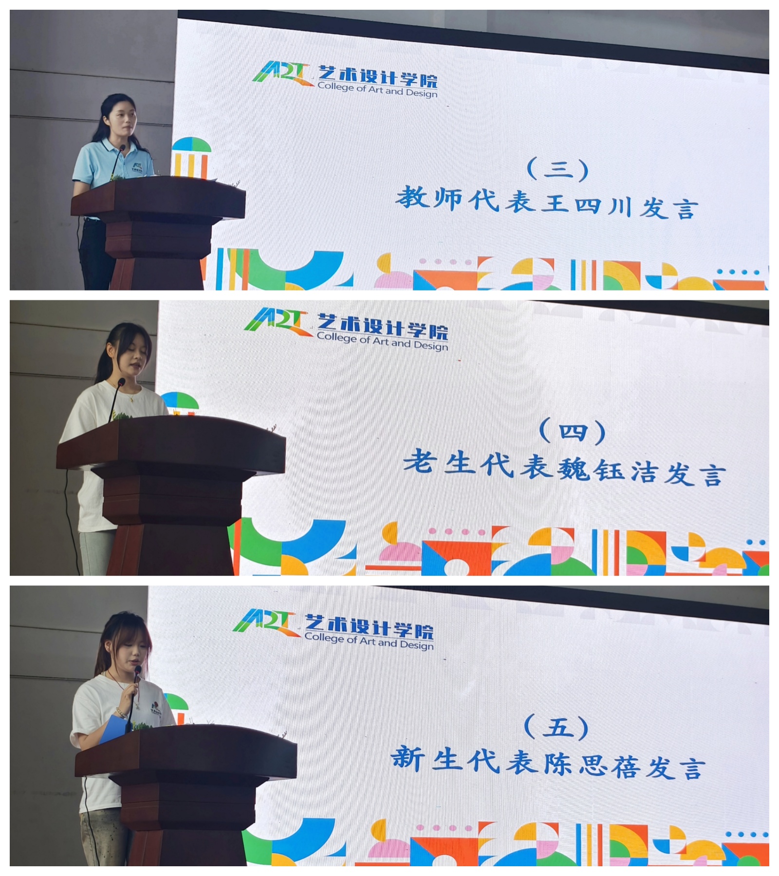 教师代表王四川上台发言,她表示艺术设计学院教师团队将全力以赴,为新生们提供最优质的教学资源和最专业的指导,耐心答疑悉心指导,陪伴大家度过每一个成长的瞬间;来自2022级建筑动画技术专业1班的老生代表魏钰洁为新生们的大学生活提出了宝贵的学习和生活建议,祝愿大家珍惜在文产院的每分每秒,用智慧和青春书写新的人生篇章;新生代表陈思蓓表示:大学是全新的起点,期待与来自五湖四海的同学们一起共同成长进步里,锻炼能力展现才华,在大学找到自己的人生方向,实现自己的人生价值。