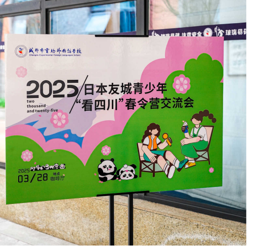 近日,四川省外事办公室与成都市实验外国语学校联合举办日本友城青少年“看四川”春令营交流活动,在2025年实验外国语学校日语月期间,迎接来自友好城市山梨县的师生代表团。艺术设计学院2023级广告艺术设计专业1班学生龚莉承担活动视觉设计工作,其设计的立体展牌、KT板等视觉物料,以高水准的专业创意赢得主办方和参与师生的一致好评,展现了我院学生扎实的专业能力和社会服务意识。