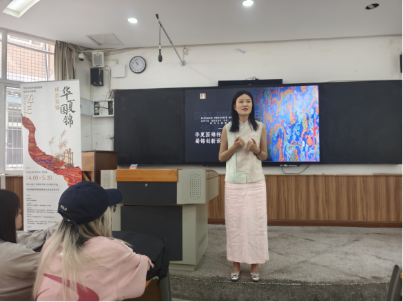 巫书秀还为成都市人民政府、文化和旅游部非物质文化遗产司、四川省文化和旅游厅主办的第九届非遗节成都丝路锦绣展“华夏国锦杯”蜀锦创新设计作品征集蜀锦文创设计作品征集做了详细介绍和参赛说明,她鼓励在场学生深入了解中国传统文化,积极参与文创活动,将传统技艺与现代设计结合,创作出兼具传统韵味与当代审美的作品,实现蜀锦文化的创造性转化与创新性发展。