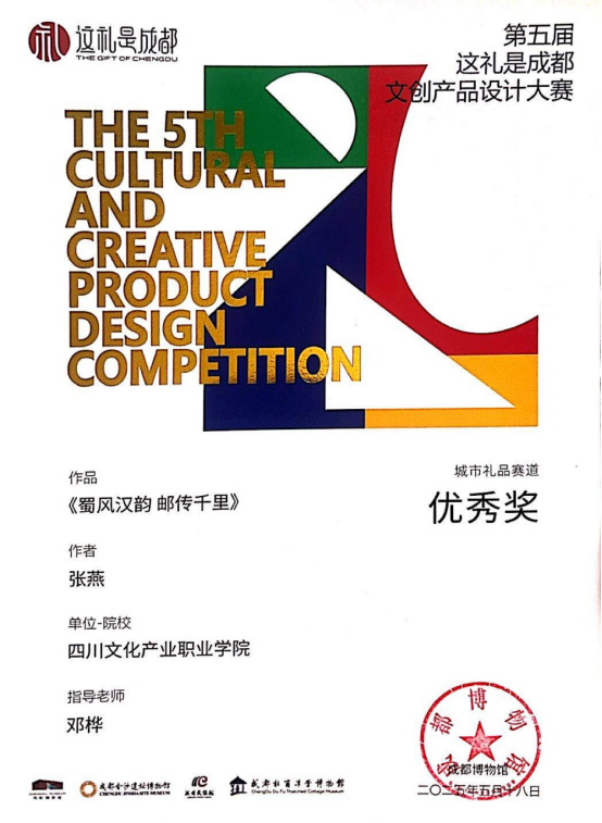 成都博物馆“这礼是成都”文化创意产品设计大赛自2019年开办以来,已成功举办五届,为成都打造“世界文创名城”、助力“三城三都”建设,注入了文博力量,为“公园城市示范区”建设增加文化色彩。四川文化产业职业学院艺术设计学院作为第五届“这礼是成都”文创产品设计大赛全城路演合作高校,于2024年3月14日成功举办了“这礼是成都”四川文化产业职业学院站全城路演,为文产师生提供了展现专业风采和文创技艺的舞台。艺术设计学院精心组织,选送了100余份作品参加大赛。2021级广告艺术设计专业1班张燕同学的作品《蜀风汉韵 邮传千里》荣获城市礼品赛道优秀奖,四川文化产业职业学院艺术设计学院荣获组织奖。