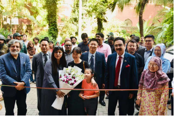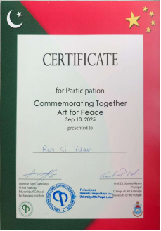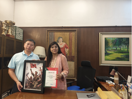 旁遮普大学艺术与设计学院院长萨米娜・纳西姆博士(Dr. Samina Nasim)为向王俊老师颁发了任思缘的荣誉证书。旁遮普大学校长穆罕默德・阿里博士(Dr. Muhammad Ali)在致辞中表示,中巴青少年以艺术为桥梁,共同回望历史、共话和平,充分彰显了“巴铁”友谊世代相传的深厚根基。