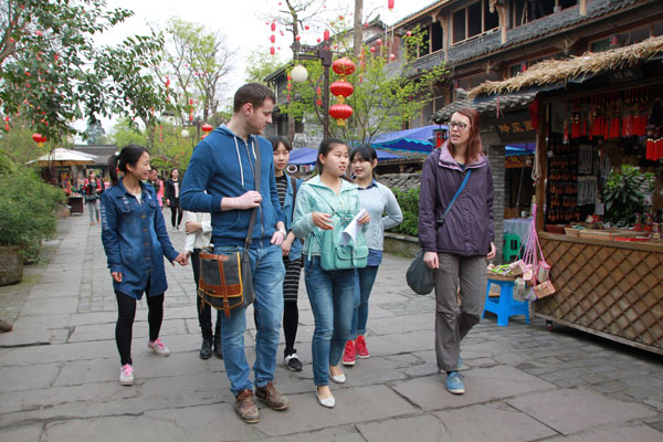 3月22日,在我院教师张云皓、聂维的带领下,12名学生志愿者前往黄龙溪,通过为游客义务提供景区讲解来传递雷锋精神,用实际行动践行社会主义核心价值观。外籍教师David 、Kristy也参与到此次活动中,给学生们的英语讲解进行现场指导。