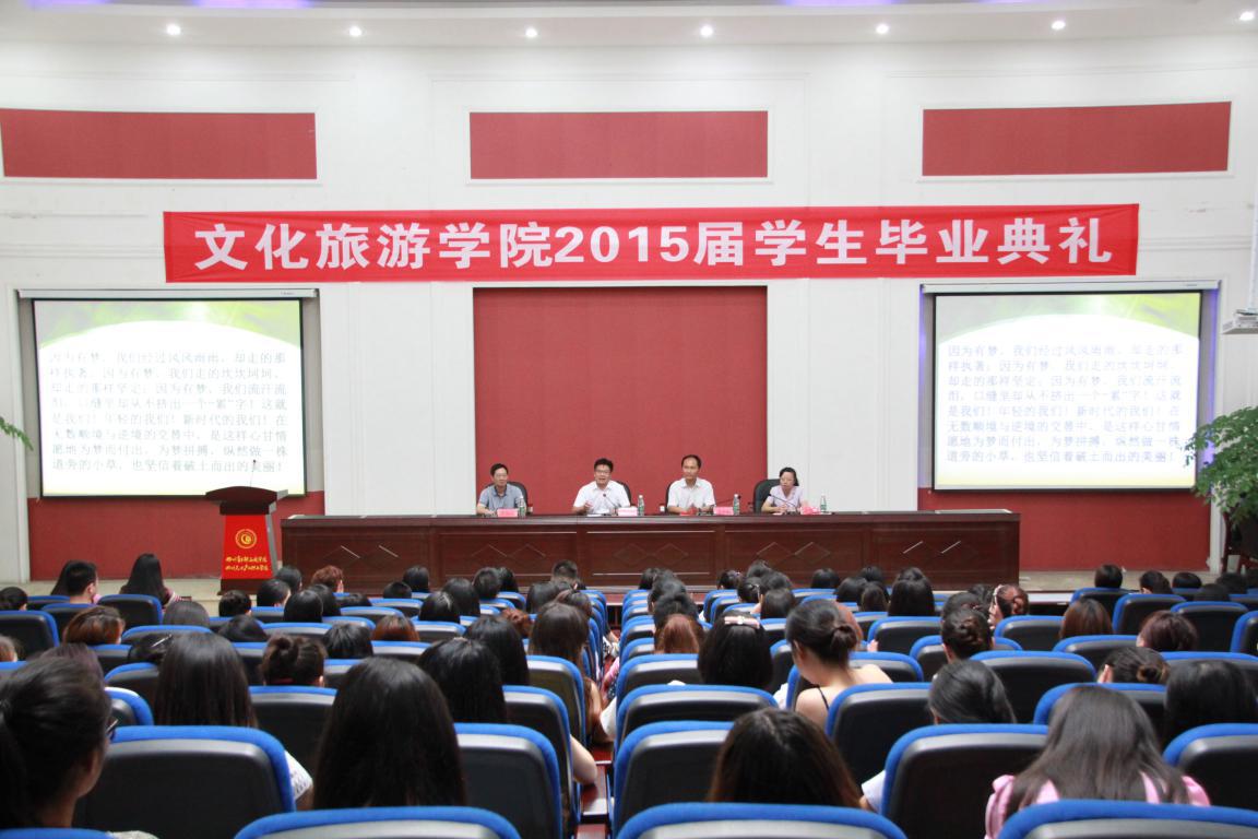 悠悠师生情,依依别离意。我院2015届毕业生毕业典礼于6月24日上午在第二教学楼多功能会议厅举行。校领导曹启富副院长、校学工部部长吴兴彬、文化旅游学院院长李晓波、文化旅游学院党总支副书记王维姝和文旅学院全体教职员工以及200余名毕业生参加了此次典礼。