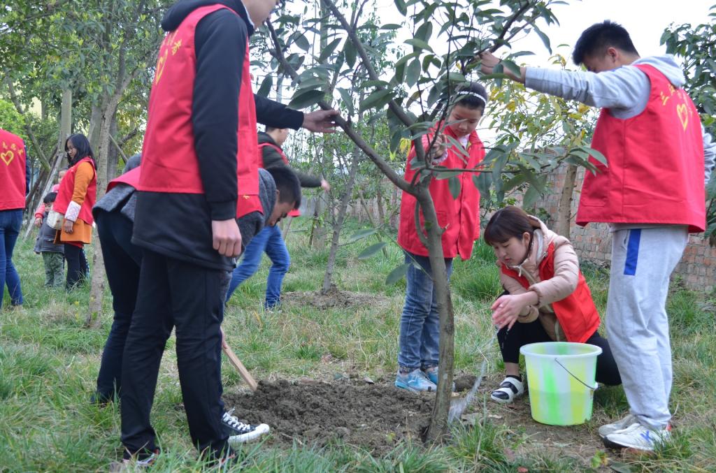 在活动现场,同学们热情高涨,辛勤劳作,有模有样地当起了“园艺工程师”。大家分工合作,有的挖坑、有的扶树苗、有的浇水,他们中虽然有的动作稍显笨拙,但丝毫不影响他们对植树节活动的热情。经过大家的共同努力,一棵棵小树“亭亭玉立”在沃土上。最后志愿者们还和社区留守孩子们一起为自己种下的小树命名,鼓励孩子们亲自动手,画出梦想中的家。