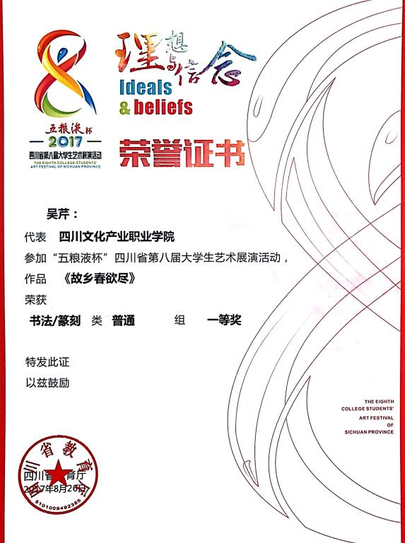 文化旅游学院2016级社区管理与服务专业学生吴芹,荣获四川省第八届大学生艺术展演活动书法/篆刻普通组一等奖。四川省大学生艺术展演活动每三年举办一次,本届由省教育厅主办、四川理工学院承办。今年有来自全省109所高校的学生作品参加了此次书法/篆刻比赛。