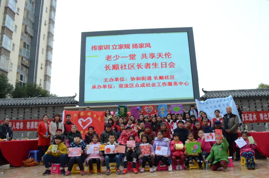 为加强我院学子对中华传统美德“尊老爱老”的认知,传递温暖爱心,12月9日上午,文化旅游学院追随阳光志愿者服务队的成员走进长顺小区,与双流区众成社会工作服务中心的工作人员在长顺社区一同开展了“温暖你我同行,尊老爱幼一起牵手”为主题的活动。