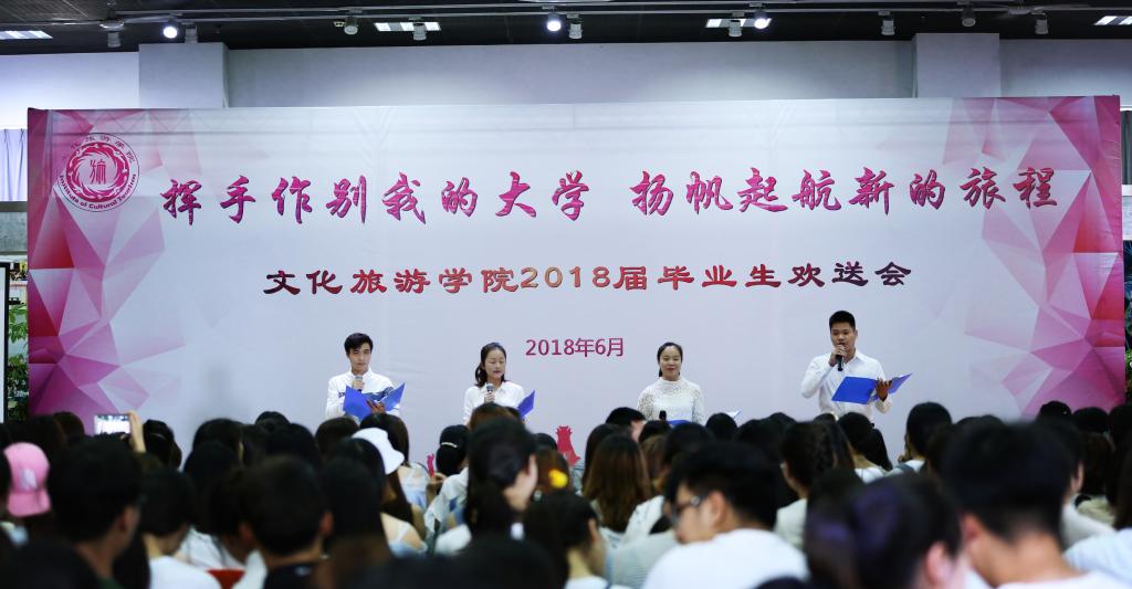 栀子花开,骊歌轻唱,又是一年一度的送别。6月13日下午,文化旅游学院在明道楼4楼举行了“挥手作别我的大学 扬帆起航新的征程” 2018届毕业生欢送会。学院全体教职工、350名毕业生参加了欢送会。