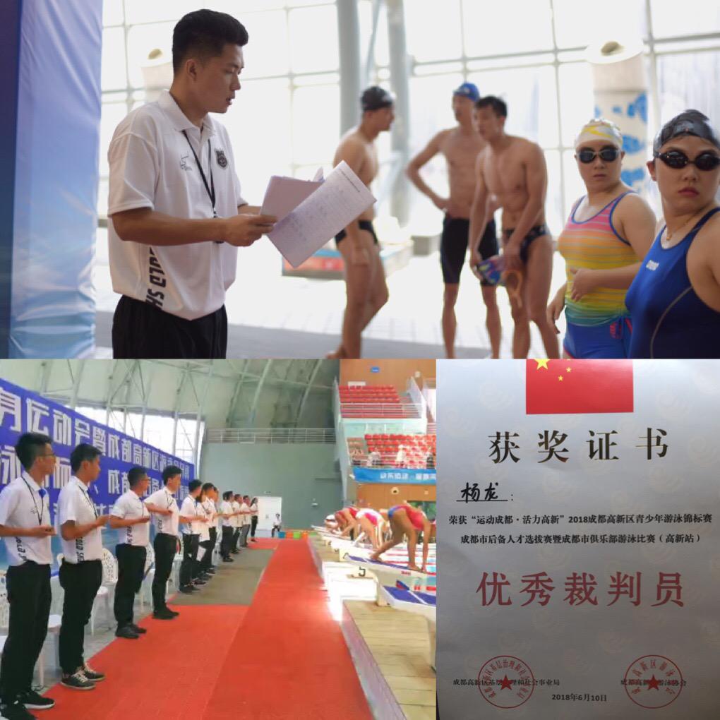 6月9—10日,成都市第五届全民健身运动会暨成都高新区游泳公开赛在成都电子科技大学拉开帷幕。文化旅游学院休闲体育专业教师杨龙受邀担任比赛裁判长。此次比赛项目多、赛程紧、任务重,杨龙带领他的团队认真严格执裁,细心开展计时组工作,及时处理突发状况,受到了主办方的一致好评,被评为优秀裁判员。