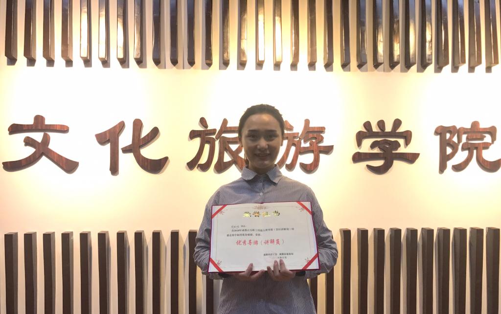 10月30日至31日,由成都市旅游局、成都市总工会举办的2018年成都百万职工技能大赛导游(景区讲解员)技能竞赛在成都市技师学院举行。来自我院2016级旅游管理专业的周欣怡同学经过层层选拔,在众多经验丰富的导游(讲解员)中脱颖而出,作为唯一的在校大学生,荣获“成都市优秀导游”称号。