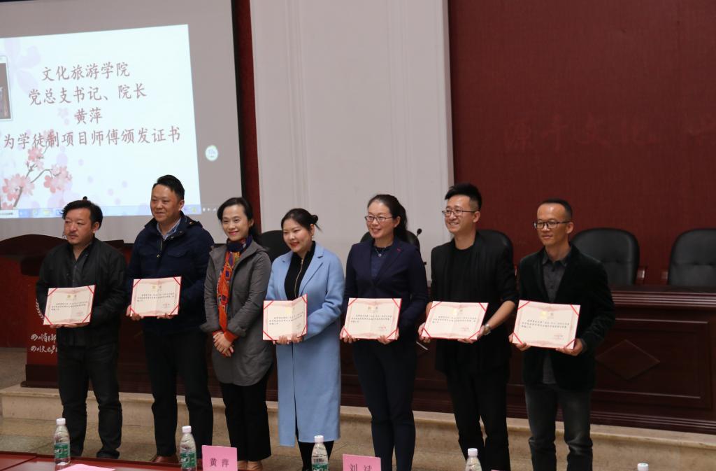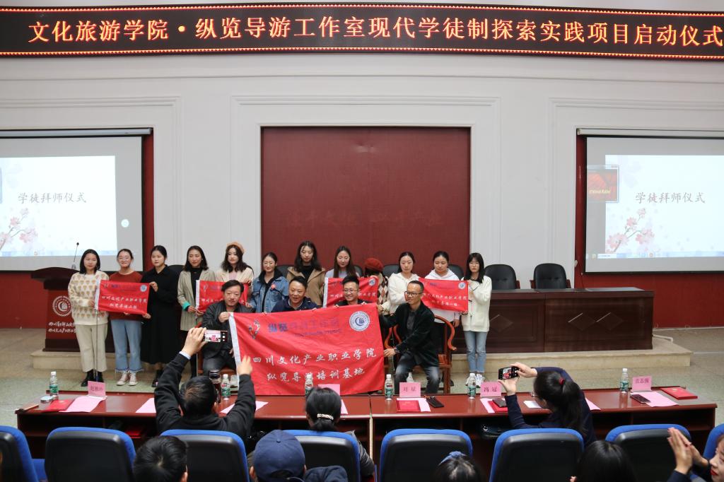 文化旅游学院党总支书记、院长黄萍代表学院为旅游管理专业现代学徒制探索实践项目的首批师傅颁发了聘书。纵览导游工作室负责人、学徒制师傅代表刘斌介绍了纵览导游工作室关于现代学徒制探索实践项目工作方案的思考。随后,学徒制师傅们端坐于太师椅,接受了来自17级旅游管理专业学生奉上的拜师茶,并将印有“文化旅游学院·纵览导游工作室”的导游旗作为礼物赠予徒弟,简单而温馨的拜师仪式成为本次活动最具仪式感的环节。