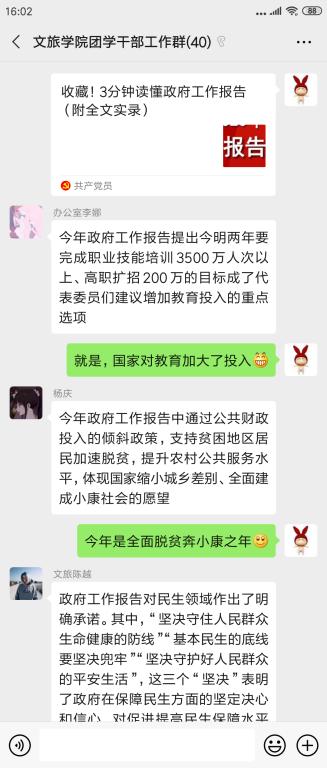为深入学习贯彻全国两会精神,引导学生关注时事热点,提高我院青年学生的政治修养和素质,近日文化旅游学院组织学生开展了“学习两会精神”主题活动。活动分为自主学习和线上集中交流学习两个阶段。