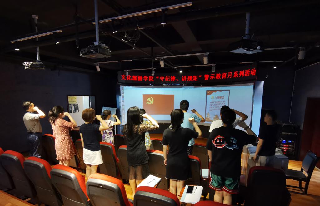 为深入贯彻落实省委十一届六次全会、省纪委十一届四次全会精神,按照校纪委开展警示教育月活动的相关要求,文化旅游学院第一党支部于6月23日上午在明道楼8楼环幕厅开展了“守纪律、讲规矩”主题党日活动。