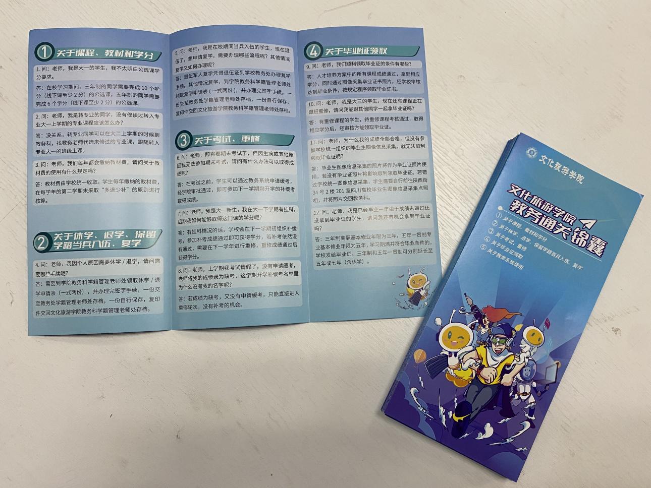 锦囊的制作经过向教务处、通识教育部、学工部等多部门调研,最终确定为5大板块,16个常识问题,内容涉及课程、教材、学分、休学、退学、保留学籍当兵入伍、复学、考试重修、毕业证领取、教务系统使用。锦囊发放到学院每位教职员工、每位学生手中,让学生从一入校便认知在读期间需要完成的学业要求,让老师们了解教务常识,较大地提高了相关工作开展的联动性和高效性。