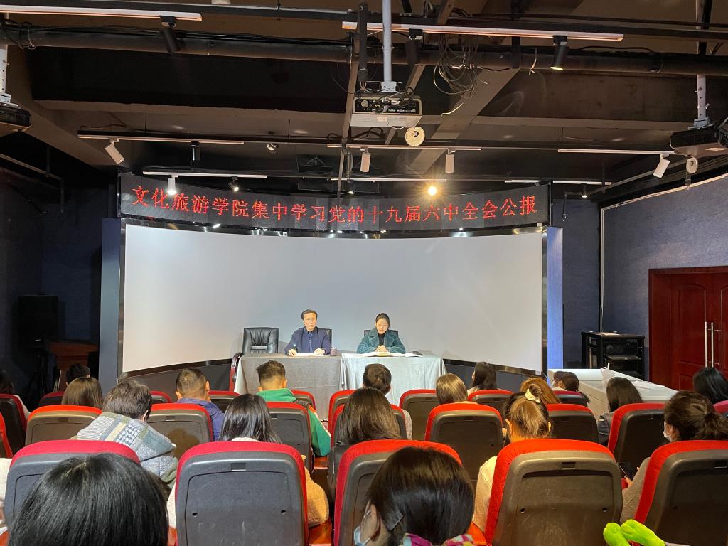 2021年11月19日下午,文化旅游学院在图情大楼8楼环屏厅召开党的十九届六中全会精神集中学习会。学习会由文化旅游学院党总支副书记田娅主持,全体教职工参加。