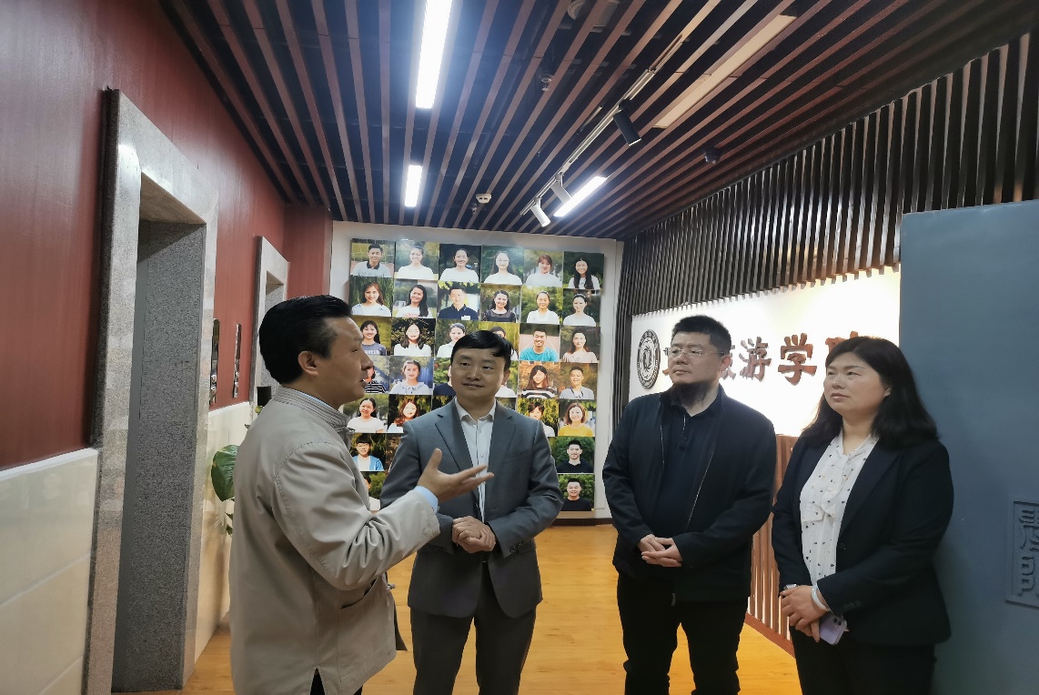 梁中正对中科大旗周道华董事长一行表示欢迎,并陪同客人参观了文旅学院的主要实训室。他简要介绍了学校发展和文旅学院建设情况。周道华对文旅学院“旅游塑形、文化树心、技术赋能”的人才培养理念表示高度认同。他介绍了中科大旗的发展历程和业务方向,就校企合作的契合点提出了具体的意见。彭容、吴勇科还就产学研合作模式、金牌解说应用场景等进行了交流。双方就合作开展人才培养、课题研究、人才共用、资源共享等达成合作共识。