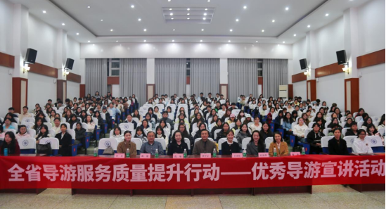 11月20日晚,由四川省文化和旅游厅指导的2024四川省导游服务能力提升行动——优秀导游进校园活动在我校举行。四川省旅行社协会秘书长范敏、文化旅游学院院长梁中正及文化旅游专业群师生共210人参加活动。