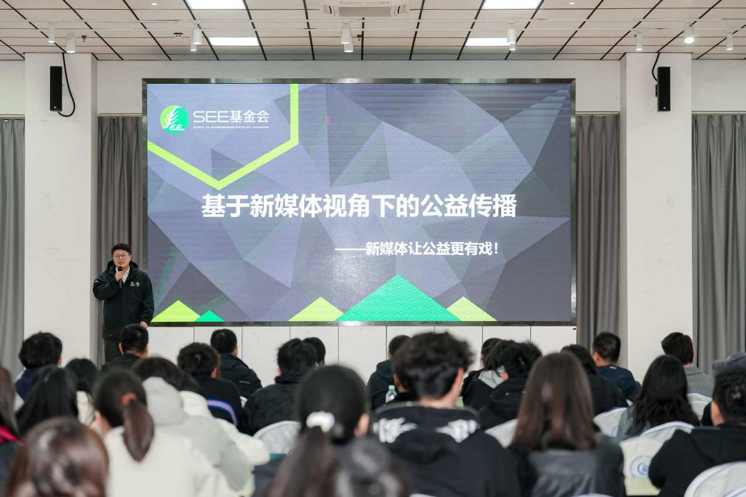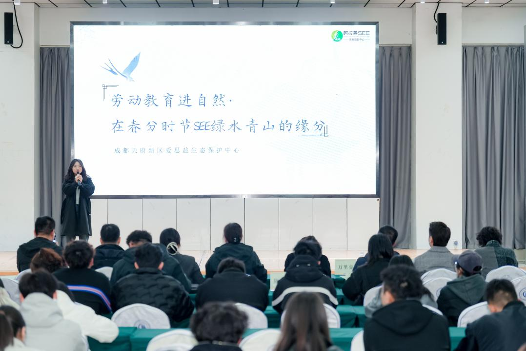 文化旅游学院党总支副书记尹亮在致辞中发出倡议,用劳动服务社会、服务人民,践行劳动最光荣的时代价值。活动特邀北京市企业家环保基金会荒漠化防治项目指导老师马婵、其达拉图与成都天府新区爱思益生态保护中心陈章敏担任主讲嘉宾,以SEE荒漠化防治项目为切入点,结合多年一线实践经验,讲述了生态保护、劳动教育、志愿服务与公益传播深度融合的鲜活案例。学生公寓宿管刘娟老师用朴实的语言,分享了在学生社区开展劳动教育的动人故事和独特经验,指出劳动教育不仅是课堂里的理论,更是生活中的点滴实践。