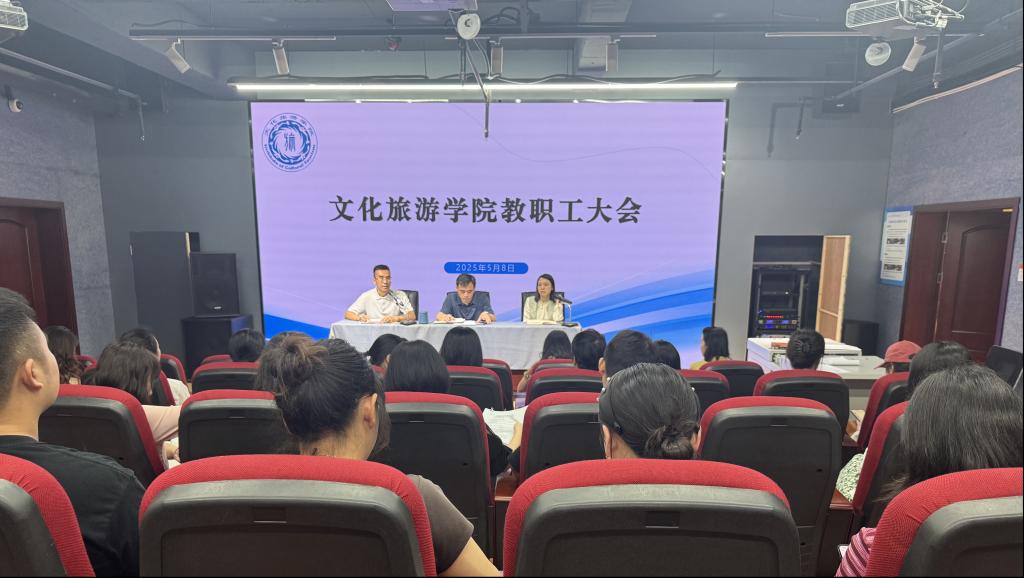 2025年5月8日,文化旅游学院召开期中教职工大会,总结前期工作并部署下一阶段重点任务。学院党总支书记宋晓、副院长黎玲及全体教职工参加会议,会议由党总支副书记尹亮主持。