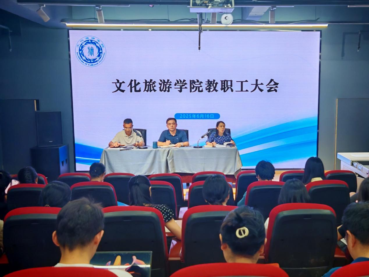 2025年6月16日下午,文化旅游学院召开全体教职工大会。学院党总支书记宋晓、副院长黎玲及全体教职工参加会议,会议由党总支副书记尹亮主持。