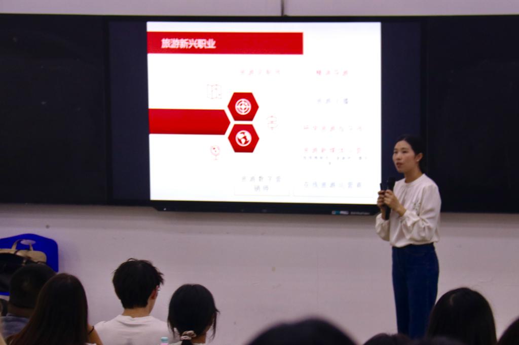 各专业介绍会内容充实、形式多样,充分体现出专业特色与人才培养亮点。旅游管理专业不仅介绍了课程体系与师资力量,还特邀三位优秀学长学姐从学科竞赛、海外留学与实践经历等角度分享成长经验;酒店管理与数字化运营专业以“认知·融入·启航”为主题,突出校企合作与数字化课程特色,为学生搭建高起点实践平台;智慧旅游技术应用专业紧扣“技术赋能旅游,实践定义真知”理念,通过真实项目案例和学长实战展示,强调“证书+实训+竞赛”融合培养路径;公共管理与服务专业聚焦行业发展趋势与学分课程结构,并由高年级学生代表汤洁分享学习体会;现代家政服务与管理专业邀请行业专家朱星伟副会长分析职业前景,并由专业教师系统介绍课程设置与发展方向。师生互动热烈,现场氛围活跃。