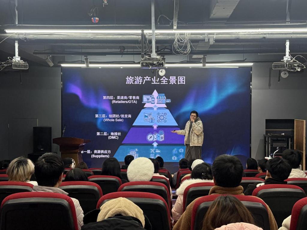 讲座围绕旅游产业全景与文旅产业链展开,系统解析了资源供应方、地接社、组团社、渠道商等四大业务层级的运作模式与核心职能。行业专家结合自身多年从业经验,以挪威、丹麦等出境旅游业务为例,生动介绍了产品设计、线路运营、市场推广等具体岗位的工作内容与能力要求,为学生勾勒出清晰行业图景与职业发展路径。