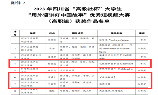 由四川省教育厅主办,高等教育出版社承办的2023年四川省“高教社杯”大学生“用外语讲好中国故事”优秀短视频大赛于2023年6月—2023年9月在全省范围内举行。大赛组委会经过专家组的网络匿名评审及工作组复核,于2023年11月公布了省级获奖名单,我校遴选入围省赛的三个作品获得一等奖2项,二等奖1项。