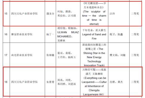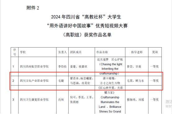 由四川省教育厅主办,高等教育出版社承办的2024年四川省“高教社杯”大学生“用外语讲好中国故事”优秀短视频大赛于2024年5月—2024年9月在全省范围内举行。大赛组委会经过专家组的网络匿名评审及工作组复核,于2024年10月公布了省级获奖名单,我校遴选入围省赛的三个作品中《唐卡:移动的佛龛》获得一等奖,《时光雕刻者——岁月未逝 韵味永存》获得二等奖,《万物皆可髹——成都漆艺 文脉赓续》获得三等奖。同时学校荣获优秀组织奖。