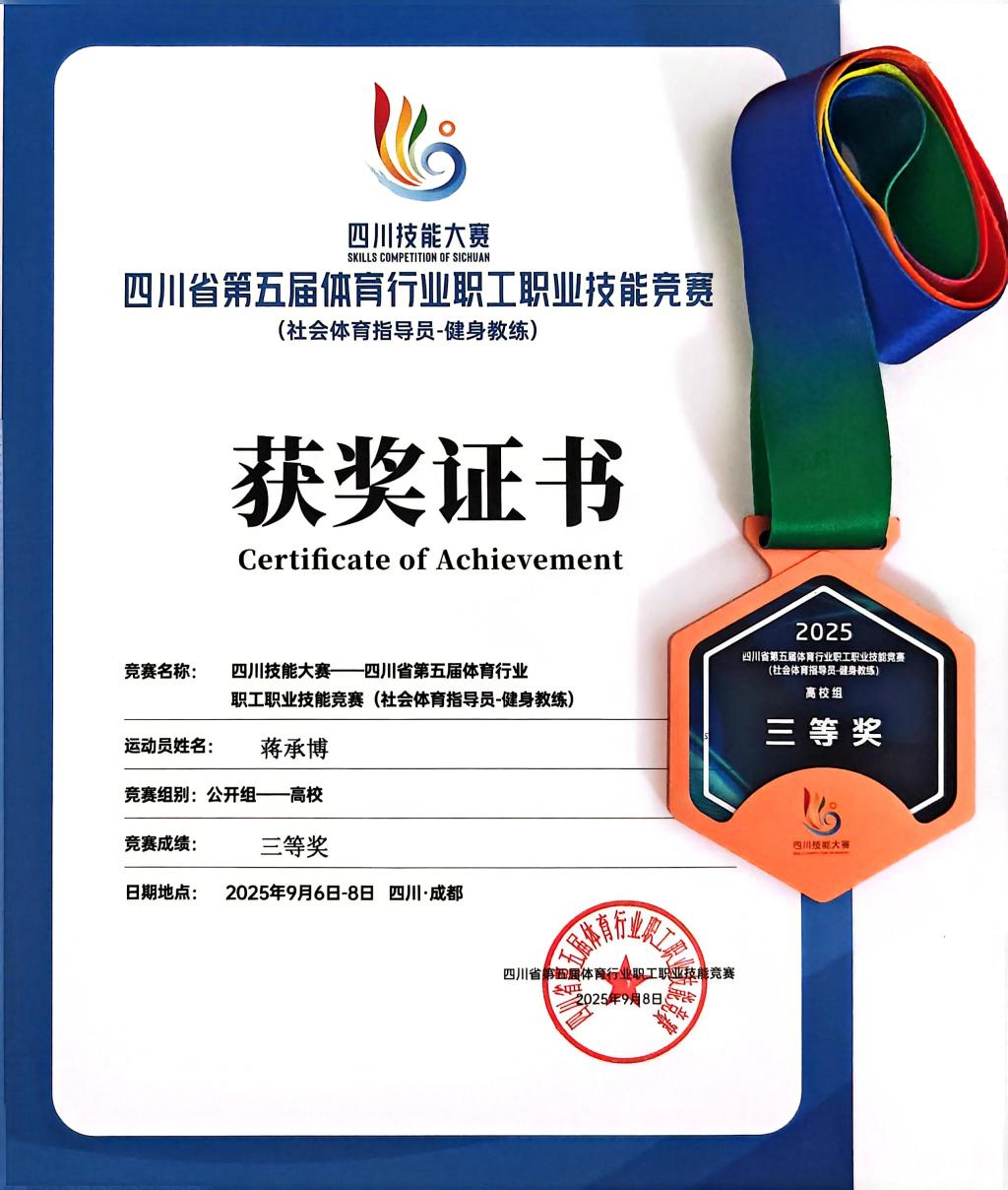 2025年9月7日,四川技能大赛—四川省第五届体育行业职工职业技能竞赛在成都市双流体育中心举行。我校23级休闲体育专业学生蒋承博在社会指导员-健身教练赛项首次参赛荣获三等奖。