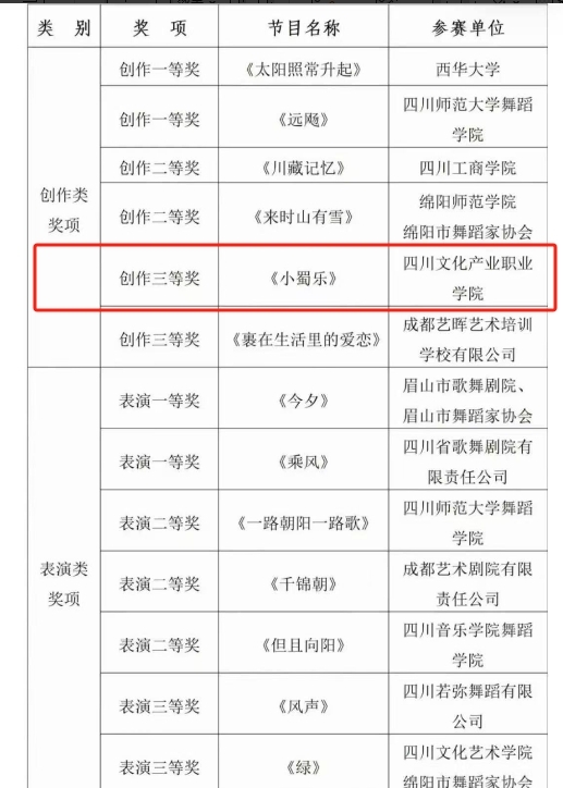 首届成绵德眉资原创舞蹈大赛近日公布获奖名单。经过激烈角逐,人文与国际教育学院舞蹈表演专业原创剧目《小蜀乐》,从65组参赛作品中脱颖而出,成功晋级决赛,最终荣获创作三等奖。