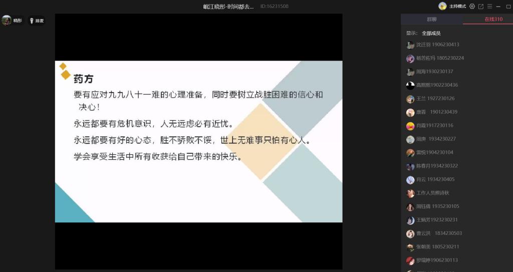 为做好疫情防控期间阅读推广工作,发挥图书馆的文化育人功能,6月9日晚,我校图书馆特邀四川岷江音乐台主播晓彤作客第43期行知大讲堂。晓彤老师利用QQ语音平台为全校300多名师生带来了“时间去哪儿了”的主题讲座,为师生解读如何思考人生、规划目标。
