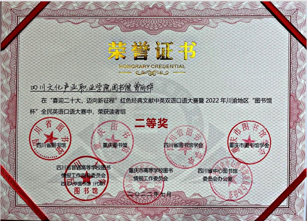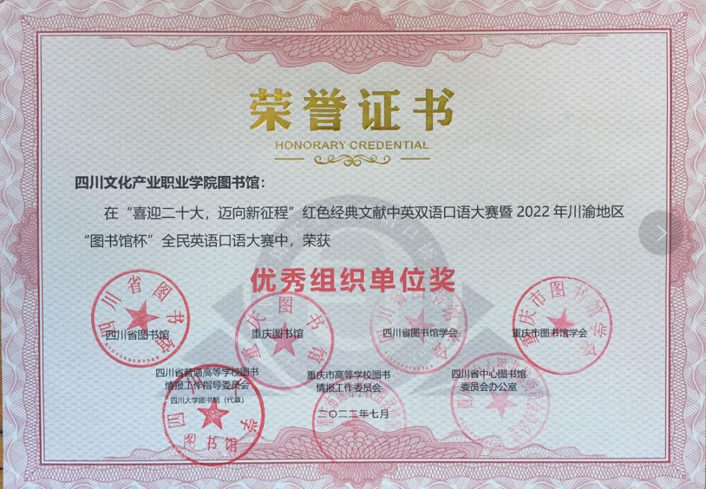“喜迎二十大,迈向新征程”红色经典文献中英双语口语大赛暨2022年川渝地区“图书馆杯”全民英语口语大赛总决赛于7月2日在四川省图书馆一楼学术报告厅举行。我校图书馆选送的曾丽桦同学在大赛中喜获二等奖,我校图书馆荣获“优秀组织单位”奖。