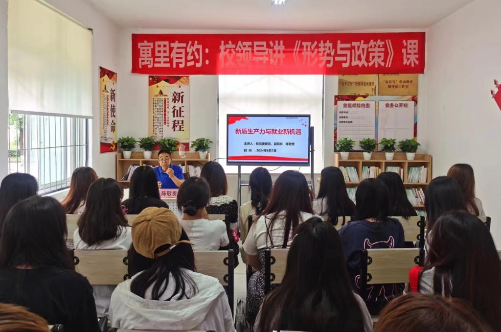 6月7日,校党委委员、副院长陈敬贵以《新质生产力与就业新机遇》为题,围绕同学们的关注点、困惑点、迷茫点,从新质生产力的概念与形式、在生活中的体现与应用、未来产业发展趋势以及大学生就业新机遇等方面一一展开。他的讲解内容丰富、生动形象,不仅为同学们答疑解惑、拓宽思路,也为同学们指明了努力方向。他寄语同学们要珍惜时光、拓展学习、练就本领、理性择业,争做新质生产力的重要实践者和推动者。