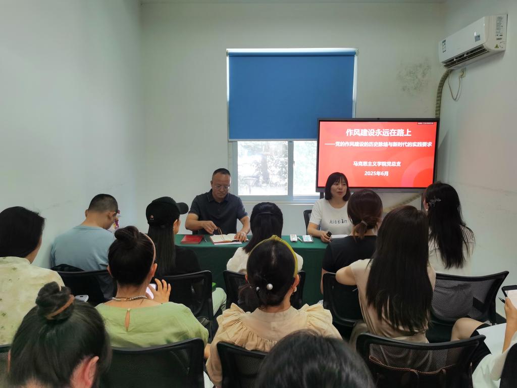 会上,马吉宏以“作风建设永远在路上——党的作风建设的历史脉络与新时代的实践要求”为题,围绕党的作风建设的重要意义、历史演进以及深入学习贯彻中央八项规定精神和加强党员干部的作风修养四个方面展开。她结合典型案例,对党在新民主主义革命时期、社会主义革命和建设时期、改革开放和社会主义现代化建设新时期以及中国特色社会主义新时代各个历史阶段党的作风建设的具体内容做了介绍,以历史逻辑指出党的作风决定党和国家事业成败,关系党的生死存亡,进一步阐明作风问题的本质是党性问题,核心是党同人民群众的关系问题。然后,带领大家对中央八项规定精神的相关内容进行具体学习,并结合马院教师工作、生活实际强调要加强自身政治修养、理论修养、道德修养、能力修养、纪律修养等。