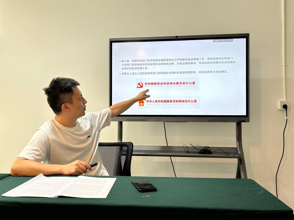 钱箐老师在会上解读了《中华人民共和国网络安全法》的三大核心原则:一是网络空间主权原则,明确网络空间是国家主权的重要领域,强调国家对其管辖范围内网络活动的绝对控制权;二是安全与发展并重原则,提出"安全是发展的前提,发展是安全的保障"的辩证关系,要求统筹推进网络安全和信息化建设;三是共同治理原则,构建政府主导、企业履责、社会监督的多元协同治理体系。他通过科技公司数据泄露致千万用户信息外泄等典型案例,向大家揭示了当前网络攻击手段的隐蔽性和危害性。会议还介绍了《国家网络安全事件报告管理办法》要求,讲解了个人和组织使用网络的规范,以及违反规定将面临的法律责任,提醒教师们在使用网络时要遵守法律法规。