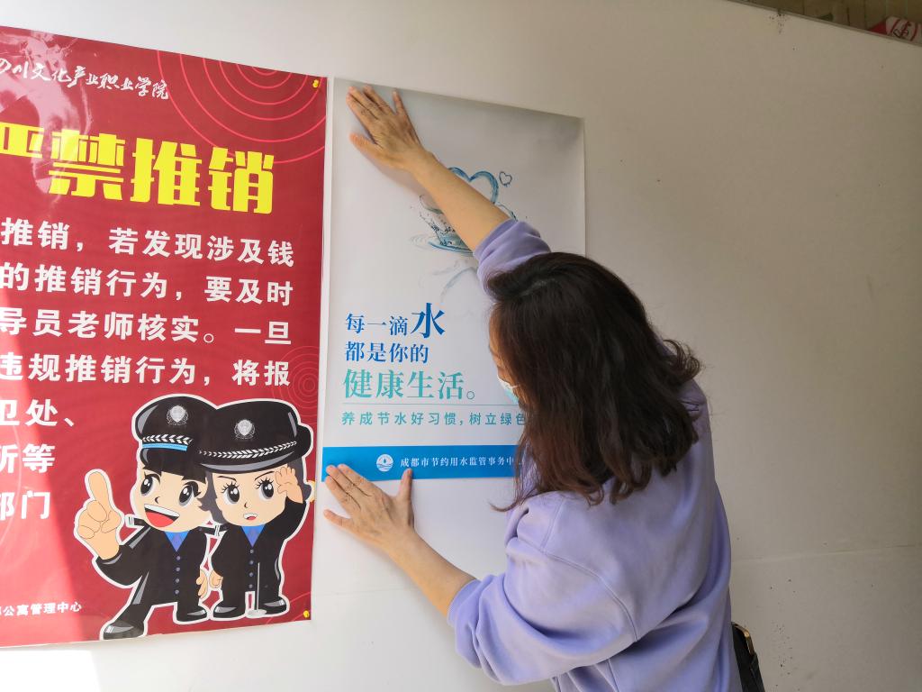 我校在成都市水务局大力支持下以第三十届“世界水日”、第三十五届“中国水周”为契机,开展公共机构节水宣传周系列活动。为提高公共机构干部职工节水意识,发挥公共机构示范引领作用,促进形成全社会节水护水的良好风尚,定于2022年3月下旬举办全国公共机构节水宣传周活动。为增强我校师生节水意识,3月23日,后勤管理服务中心在我校做好疫情防控工作下在逸飞广场及学生公寓园区开展宣传活动,通过布置宣传展板、发放宣传资料、现场解说等形式,向师生传播普及节约水资源、珍惜水资源、爱护水利工程等知识和理念,号召全校师生共同保护水资源、节约用水,全面推动水生态文明和谐发展,不断提高师生对“世界水日”“中国水周”的认知度。