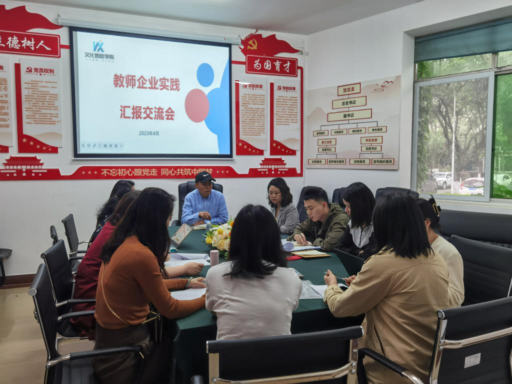 为了贯彻党的二十大精神 打造新时代高质量教师队伍,提升教师实践教学水平。文信学院2023年4月13日在温故楼110召开教师企业实践汇报交流会,出席此次交流会的有文化信息学院院长罗环敏,党总支副书记糜娜,学生科负责人陈虹森及专兼职教师代表。