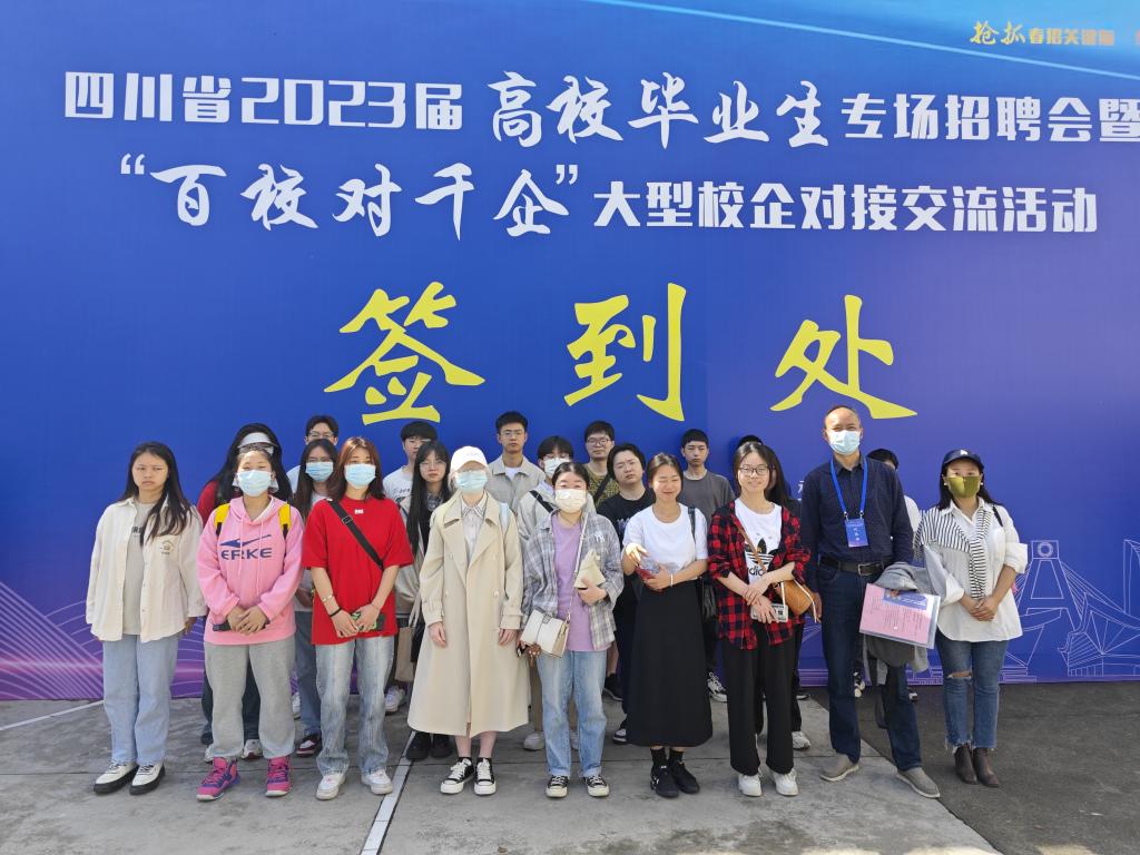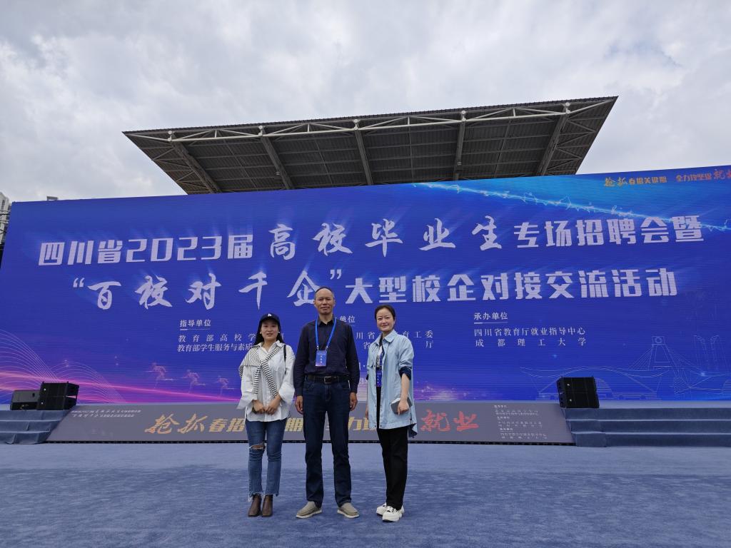 四川省2023届高校毕业生专场招聘会暨“百校对千企”大型校企对接交流活动于5月7日在成都理工大学举行。学校招生就业处处长陈怡帆、文化信息学院院长罗环敏、文化信息学院辅导员刘茂林与我校32名毕业生前往活动现场。