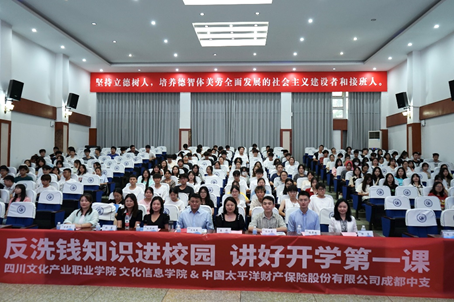 为增强师生的防诈骗和反洗钱能力,宣传普及反诈与网络安全知识,营造平安和谐的校园环境,文化信息学院特邀中国太平洋财产保险股份有限公司成都中心于2023年9月14日在二教105举办了以“反洗钱知识进校园,讲好开学第一课”为主题的防诈骗暨网络安全知识讲座。中国太平洋财产保险股份有限公司成都中心冉文杰总监及工作人员,学院党总支副书记糜娜、学生工作科全体辅导员参加了讲座。