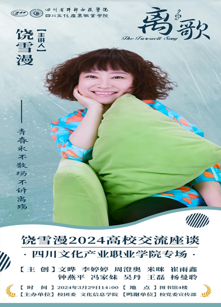 近日,四川文化产业职业学院文化信息学院特邀四川籍青年作家饶雪漫及其新网剧《离歌》主创团队,到校开展文信致远-青春就业大讲堂暨高校分享座谈会。