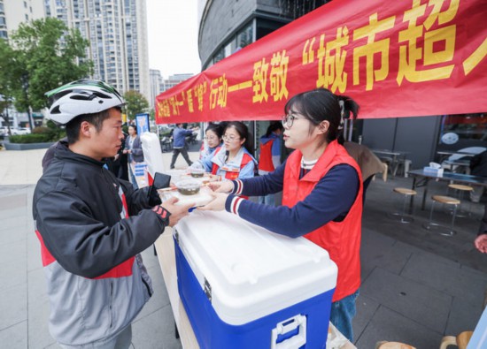 在浙江省诸暨市陶朱街道商业综合体的暖心关爱服务点,志愿者给外卖员提供爱心餐(2025年11月7日摄)。新华社记者 徐昱 摄