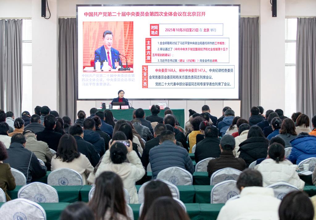 会议强调,学习好、宣传好、贯彻好党的二十届四中全会精神,是当前和今后一个时期的重大政治任务。全校上下要以此次宣讲为契机,在“学深悟透”上持续发力,在“知行合一”上精准发力,在“落地见效”上凝聚合力,切实把学习成果转化为推动学校高质量发展的强大动力和务实成效。要以更加昂扬的精神状态和更加扎实的工作作风,锐意进取,攻坚克难,奋力谱写学校事业发展新篇章,为以中国式现代化全面推进中华民族伟大复兴贡献智慧和力量。